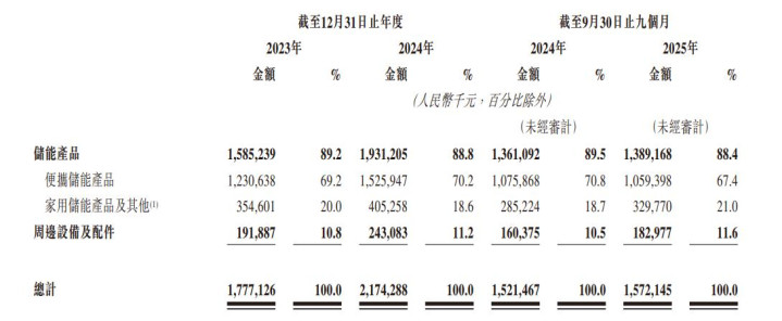 据招股书显示,2024年时,德兰明海储能收入占比为88.8%,是公司的核心收入来源,其中便携储能产品的收入占比为70.2%,家用储能产品及其他的收入占比为18.6%。另外周边设备及配件的收入占比为11.2%。